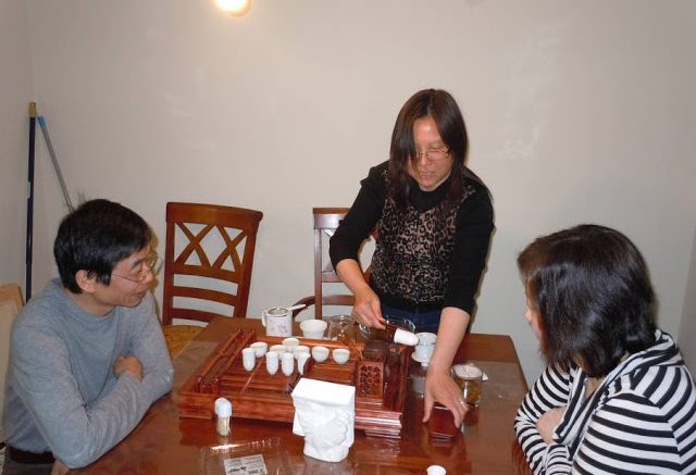 俩位教授与从事神经学科研究,在斯坦福大学的李惠芳和在旧金山加州医学院的李海燕原是华东师大生物系的同学,来到美国后,都在美国一流的高等学府从事科研和教育工作。在 “施贵宝” 制药公司的陈炳良也与学者们探讨着刚被FDA 批准上市的免疫药物CTLA4。5月14日的聚会,校友们在谈论人生奋斗之时,还探讨了子女的前程等。李惠芳和朱云龙忙了一整天,烹饪了一桌正宗的上海大餐。晚餐后,李惠芳还演示并服务给各位健康养身的茶道。通过洗茶,闻茶,品茶,加之香喷的茶味和精细的茶具,细饮慢品,体茶之真味,得茶之真趣。在品茶中,领略个中的知识,感悟人生,探寻生活的内涵。聚会虽晚也得散,只能说, 感谢, 太感谢了!