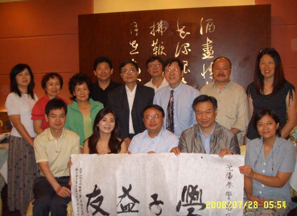 美中上海友好协会,华师大北加州校友会除了向沈阳参赞颁发了贺状,两协会还向沈阳参赞赠送了前天出版的《奥运金山》纪念册,申办2008奥运纪念封,更使会场人员惊奇的是, 美中上海友好协会副秘书长,著名书法家陈光硕即席挥毫 “学子益友” 沈阳参赞惠存, 落款是美中上海友好协会,华东师大北加州校友会。与会者纷纷在“学子益友”四个大字下签下自己的名。沈阳参赞在午餐会上也热情赞扬并肯定与湾区侨学界的珍贵情感,在五年多的时间里,和各位结下了深厚感情,希望保持联系,他还把邵巍参赞介绍给大家。邵巍参赞是接替即将离任的现任参赞沈阳。邵巍参赞抵达旧金山才一周,他风趣的说,我现在在旧金山工作,还是受教育部领导,沈阳就是我的领导。并希望在旧金山工作期间,能得到大家的支持。