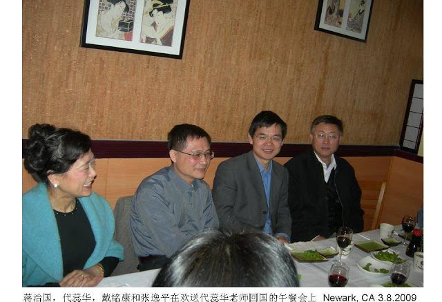 母校代蕊华老师即将完成他在柏克利大学做访问学者的访问期,北加州湾区太平洋牙医诊所老总,校友蒋治国医生在上周末邀请部分北加州校友,在紐沃克的狮子城为代蕊华老师举行了欢送会。欢送会的头一道节目是人生哲学的探讨座谈,蒋医生首先介绍了自己丰富的人生经历,高考被录取在华师大历史系,又就读于同济,最后以学医为自己的生涯, 他经验丰富,创业性强。蒋医生说,在与代蕊华老师的接触中,觉得代老师为人诚恳,思维敏捷,是我们的好校友,今天的活动安排主要是为代老师的。在场的其他校友也纷纷赞扬了代蕊华老师在柏克利大学的一年中,利用周末时间与校友紧密联系,参加各种社会活动,尤其是去年刚到美国,就与校友一起参加保卫2008北京奥运圣火在旧金山的传递,参加多个为中国四川大地震赈灾活动,今年年初,又参加由华师大北加州校友会发起和组织的北加州侨学商界“对中国中长期教育改革纲要”的座谈讨论会,大家对代蕊华老师作了高度赞扬。代蕊华老师也很高兴与校友们在一起,他觉得一年来,不但在柏克利大学学到丰富的知识,在参与校友会活动中,也学到了许多在国内学不到的社会知识和有益的经历。欢送代蕊华老师的座谈在品尝寿司中进行,配上加州红葡萄酒,香酒美味,尽在乐趣之中;并聆听了人生哲学的肺腑之言,表达了校友,朋友间的深情厚谊,情意尽在美酒和寿司之中。